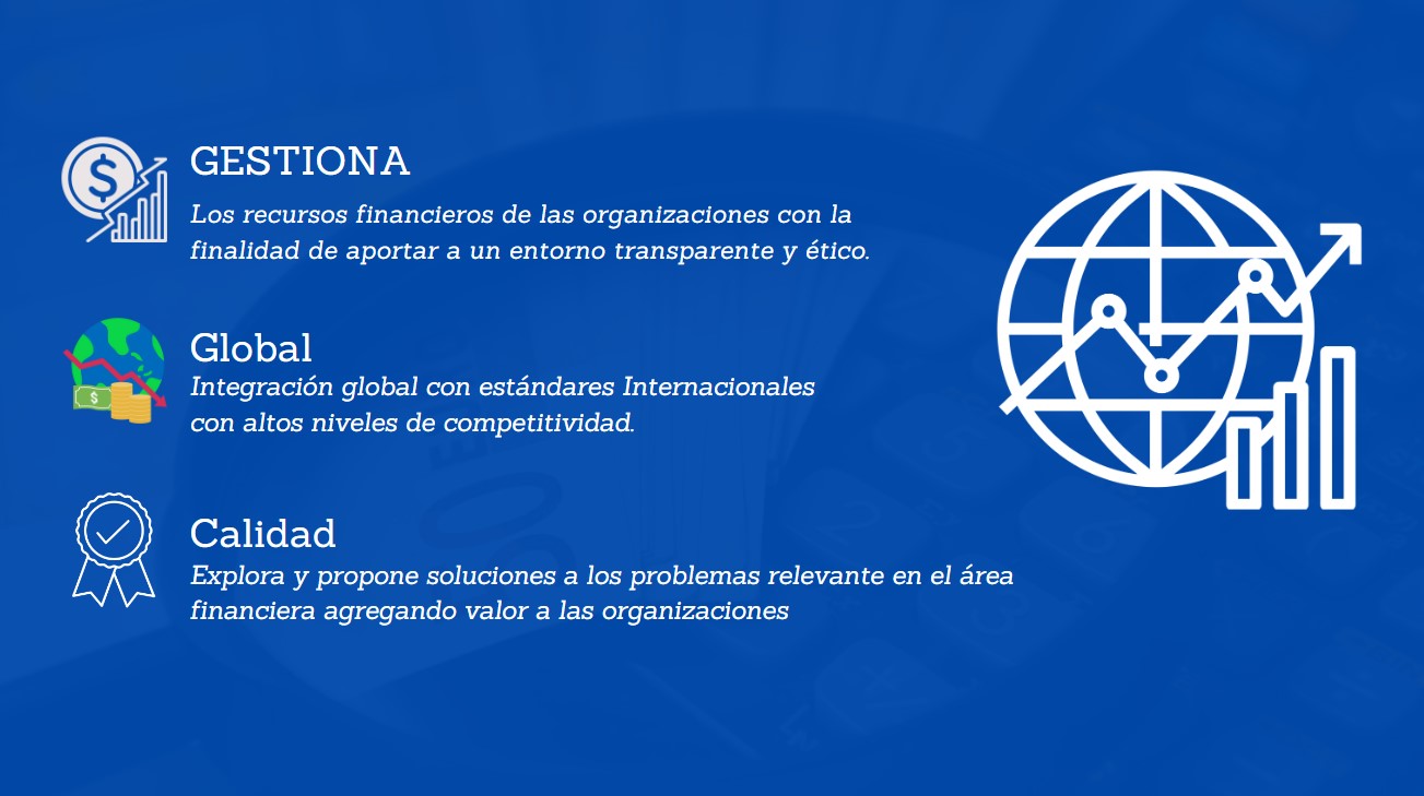 Este programa que parte de los conocimientos e informaciones generados desde la contabilidad, la trasciende, formando un profesional capaz de analizar y gestionar todo el espectro financiero, para tomar decisiones y aportar soluciones que contribuyan a optimizar la eficiencia y eficacia de las operaciones de las organizaciones.